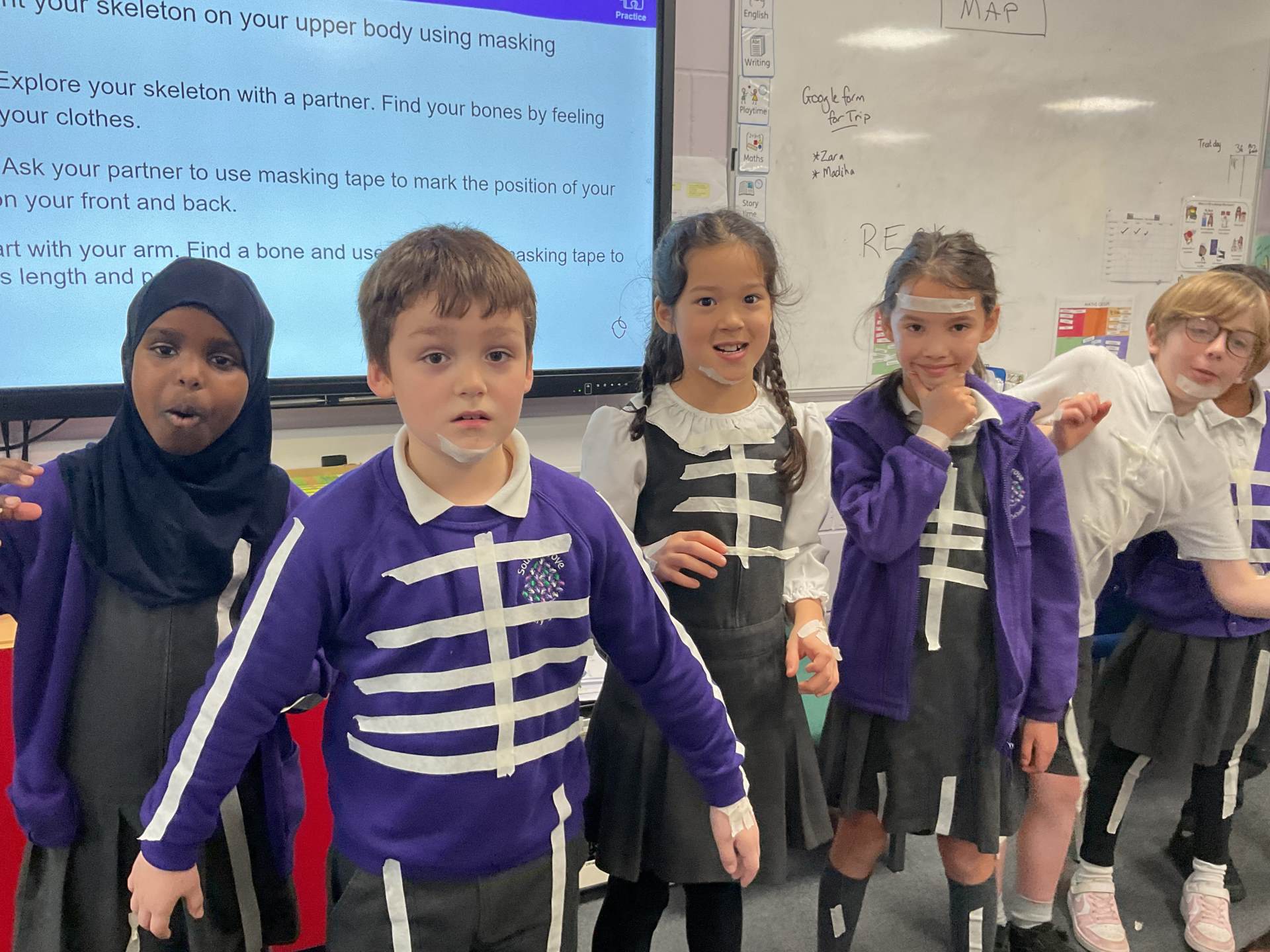 In our science topic we have been learning about the human body focusing on the skeleton. We discussed how when we are first born, we have 300 bones in our body and that they fuse together over time to create the 206 we have by early adulthood. Our skeleton helps us to move, stay standing and protects many of our vital organs. We used masking tape to map our skeleton on our body.